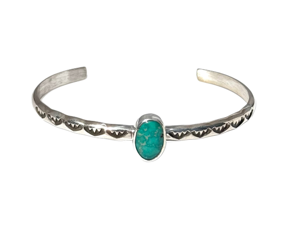 Hand Stamped Turquoise Cuff- A customer favorite and timeless gift, these hand-stamped sterling silver cuff bracelets are crafted with care by Native American artisans in New Mexico. Each bracelet features unique stamp work and genuine turquoise, with stone colors ranging from vibrant blue to earthy green, no two are exactly alike. Made from pure sterling silver, these cuffs are sturdy yet dainty, designed to fit an average woman’s wrist (approximately 6"). Slightly adjustable for a final fit, just bend gently and only once when the piece finds its forever home. As always, avoid bending near the stone.
