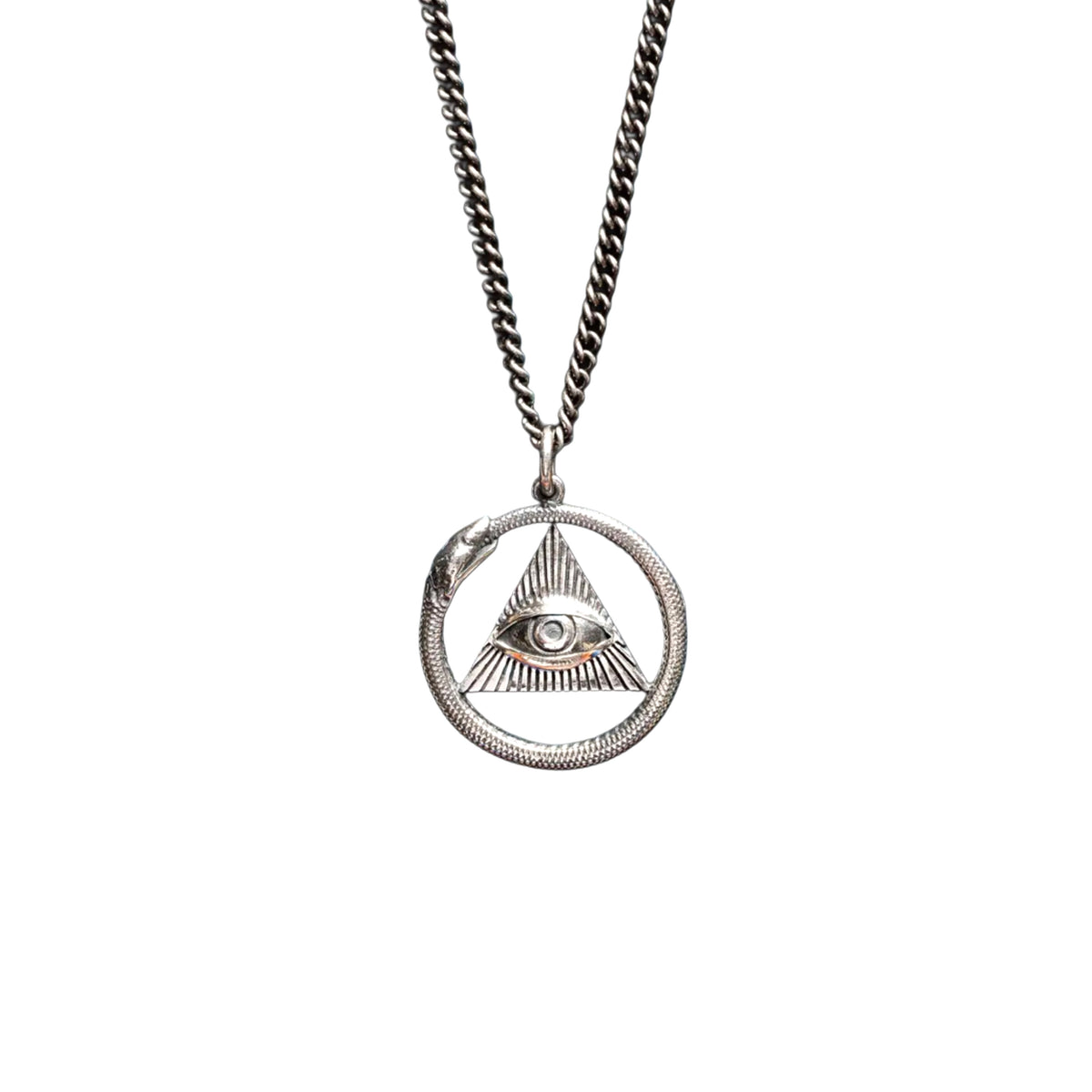The All-Seeing Eye Ouroboros Necklace unites two ancient symbols into one commanding talisman. The all-seeing eye, a divine emblem of awareness and spiritual protection, watches over the wearer, shielding from negative forces while offering insight and truth. Encircling it is the Ouroboros, the mythical serpent consuming its own tail, representing the eternal cycle of life, death, and rebirth.