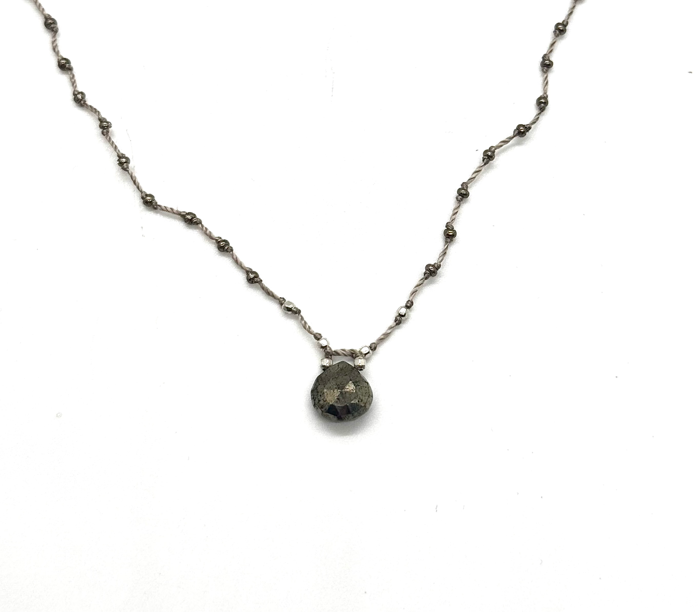 Pyrite Silver Briolette Boho Braided Necklace(16.5 inch) handmade crochet braided silver silk thread necklace with Pyrite Briolette gemstone, Silver plated 2mm cube beads, Silver plated clasp with 1 inch Silver plated extension. Pyrite is seen as a "money magnet" that can help attract financial opportunities and prosperity.