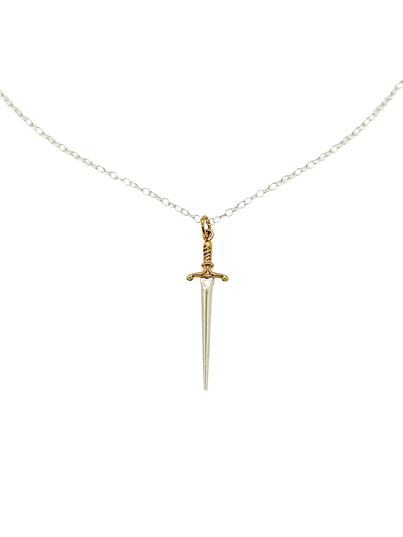 Sword Of Truth Necklace |Sterling Silver- All parts of this sterling silver sword necklace with bronze handle are wonderfully detailed. From the point to the pommel, this sword charm looks like a miniature of an actual Medieval sword. The pronounced quillion and the twisted grip are especially fierce! Swords are one of the earliest weapons found in cultures the world over, and as such are saturated with cherished meaning and symbolism. Swords can connote power, protection, chivalry, truth, enlightenment, action, and justice. In Christian thought it primarily represents righteousness, while in Congo tribes of Central Africa swords are symbols of transition, especially between life and death. In the symbolic language of tarot, swords represent the realm of the mind, specifically the navigation of thought.