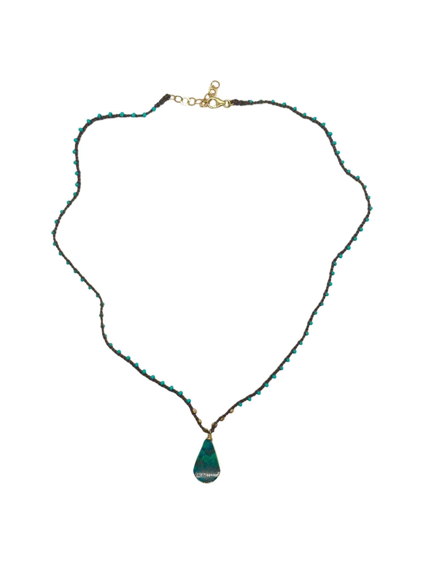 Chrysocolla Turquoise Braided Silk Thread Necklace Handmade brown crochet braided silk thread necklace with Chrysocolla Turquoise teardrop, turquoise seed beads, 14K gold filled 2mm cube beads, 14K gold-filled clasp with 1.5" gold filled extension. Length: 16.5"