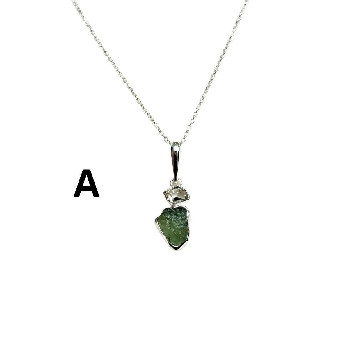 Moldavite & Herkimer Diamond Gem Necklace – Sterling Silver | 18" Chain