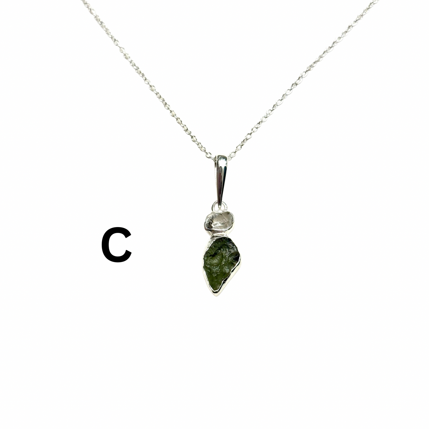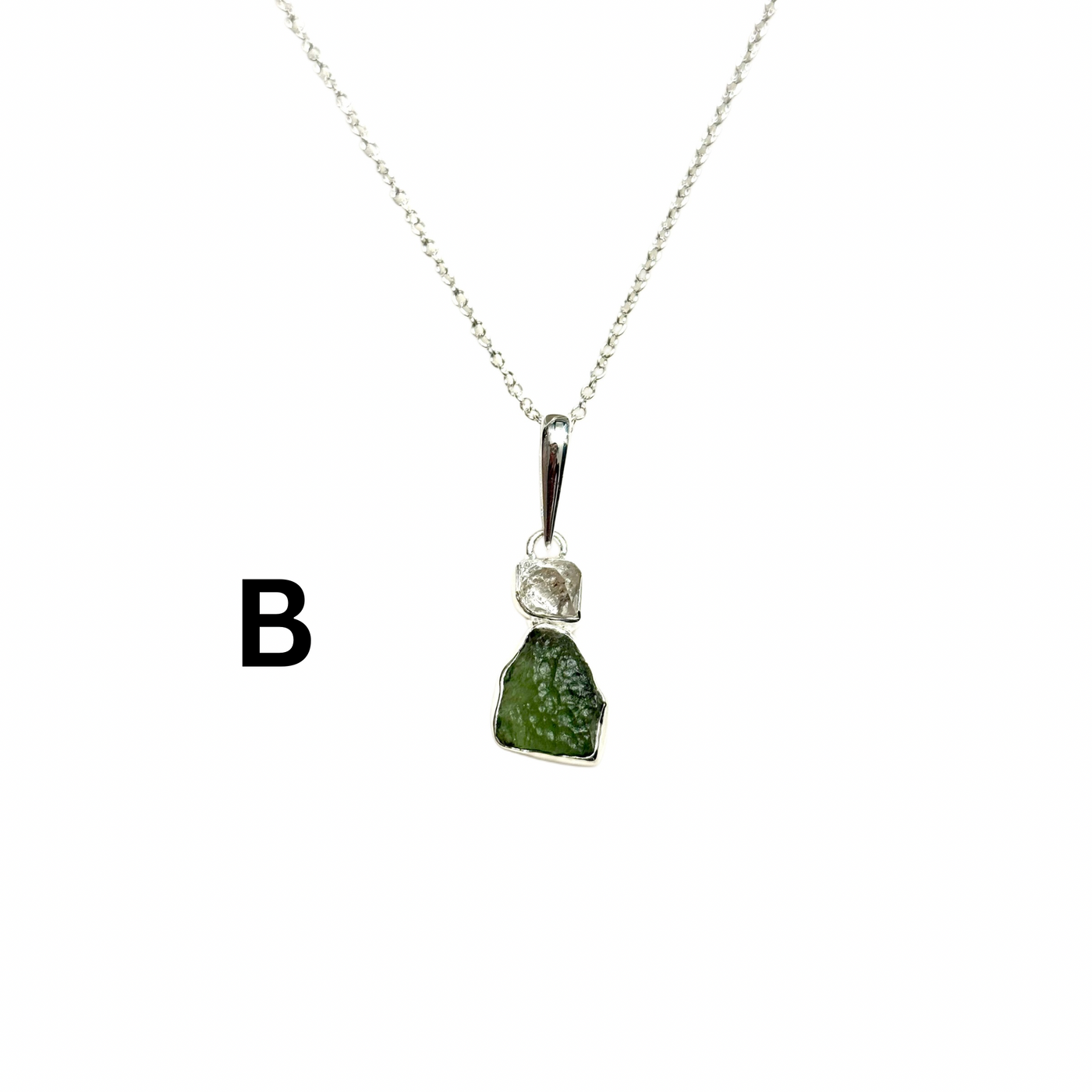 This sterling silver pendant combines Rough Moldavite with a sparkling Herkimer Diamond, creating a piece that is both refined and edgy, a perfect balance of raw celestial power and luminous beauty. The pendant hangs from an 18-inch silver-plated chain, making it ideal for everyday wear or layered styling.
