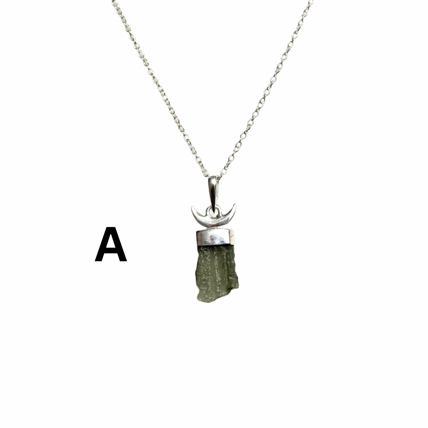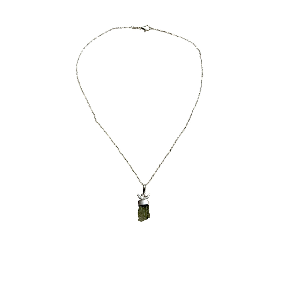 Esprit Creations Moldavite Moon Necklace features a genuine Moldavite stone suspended beneath a sterling silver crescent moon, a symbol of intuition, evolution, and celestial guidance. Each pendant rests on an 18-inch silver-plated chain, making it the perfect length to wear close to the heart.